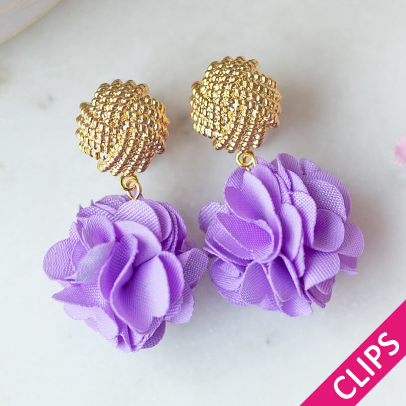 Verleihe Deinem Look einen Hauch von Zauber mit diesen außergewöhnlich eleganten Knoten-Ohrclips mit fliederfarbenem Blüten-Pompom. Diese Designer-Ohrringe vereinen klassische Formen mit einer verspielten Leichtigkeit. Perfekt für alle, die das Besondere lieben. Das Oberteil der Ohrringe besteht aus einem vergoldeten Clips in stilvoller Knotenoptik. Diese filigrane, glänzende Struktur bringt sofort eine edle Note ins Spiel und wirkt zugleich modern und zeitlos.