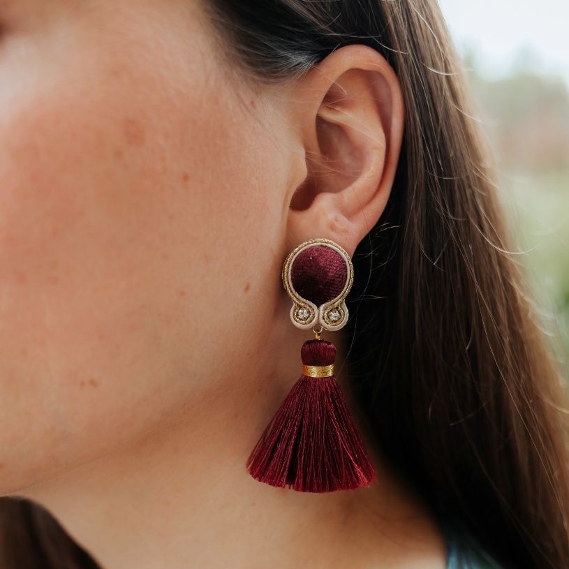 Entdecke die zauberhafte Welt von handgefertigtem Ohrschmuck mit diesen einzigartigen, eleganten Samt-Soutache-Ohrringen in Rot und Gold. Diese außergewöhnlichen Statement-Ohrringe sind das Ergebnis präziser Handwerkskunst und liebevoller Gestaltung. Kunsthandwerker mit langjähriger Erfahrung und einem Gespür für Details fertigen die Ohrringe aus hochwertigen Materialien wie seidigen Bändern, funkelnden Steinen und kleinen, schimmernden Perlen. Dadurch entstehen nicht nur Ohrringe, sondern kunstvolle Schmuckstücke, die sofort ins Auge fallen und jedes Outfit auf ganz besondere Weise veeln.