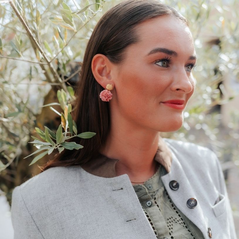Die hochwertige Verarbeitung dieser Ohrringe zeigt sich in jedem Detail - vom präzise gearbeiteten, vergoldeten Stecker bis hin zum sorgfältig gefertigten Stoff-Pompom. Die Kombination aus Goldglanz und Rosarot macht diese Ohrringe zu einem idealen Accessoire für elegante Anlässe, romantische Abende oder einfach als stilvoller Hingucker im Alltag.