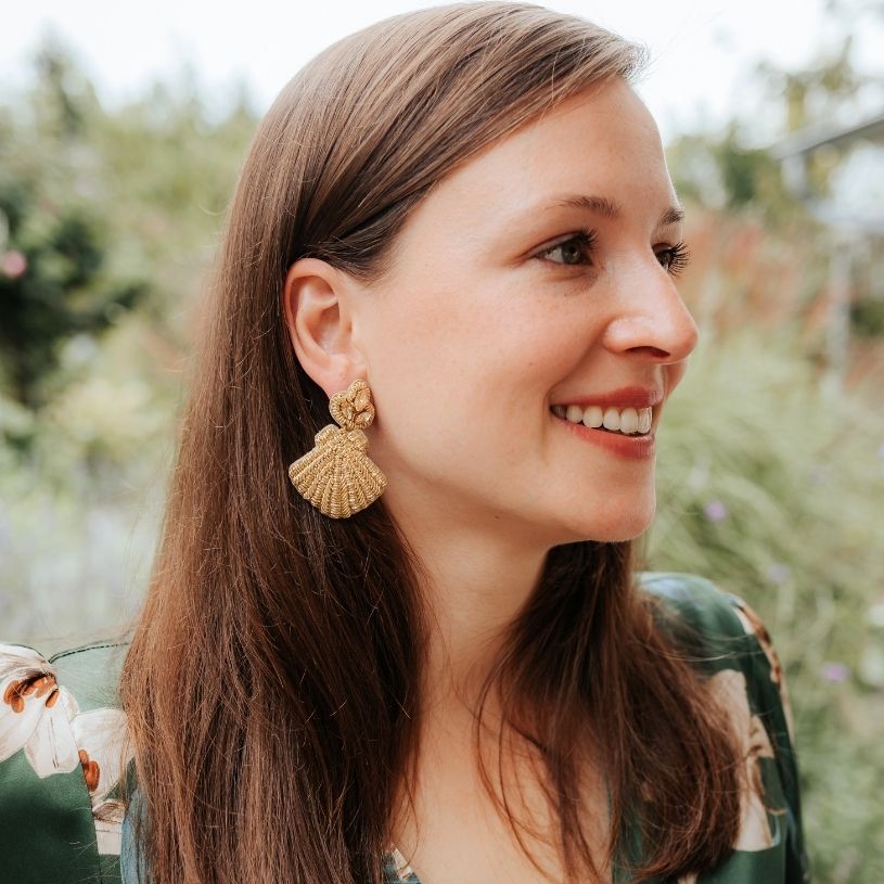Die goldenen Muschel-Ohrringe sind aus seidigen Soutache-Bändern geformt, die sich sanft um schimmernde Perlen und funkelnde Steine schmiegen. Ihre opulente Gestaltung zieht alle Blicke auf sich, während sie durch ihre Leichtigkeit einen angenehmen Tragekomfort bieten. Trotz ihrer imposanten Erscheinung sind diese Statement-Ohrringe überraschend leicht, sodass Du sie den ganzen Tag oder Abend über problemlos tragen kannst.