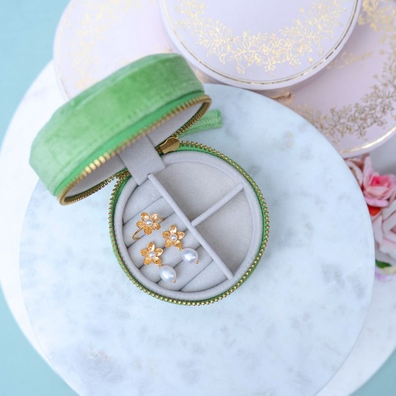 Und all dies ruht in einer Samtbox, die selbst schon ein kleines Kunstwerk ist. Das frische Grün, die zarten Stickereien, die Blumen und das goldene Wort LOVE – all das macht die Box zu mehr als nur einer Aufbewahrung. Sie ist eine Botschaft. Eine Erinnerung. Ein kleiner Schatz für sich. Innen bietet sie Deinen Schmuckstücken ein sanftes Zuhause, geordnet, weich und sicher. Ein Ort, an dem Schönheit aufbewahrt und wiedergefunden wird.